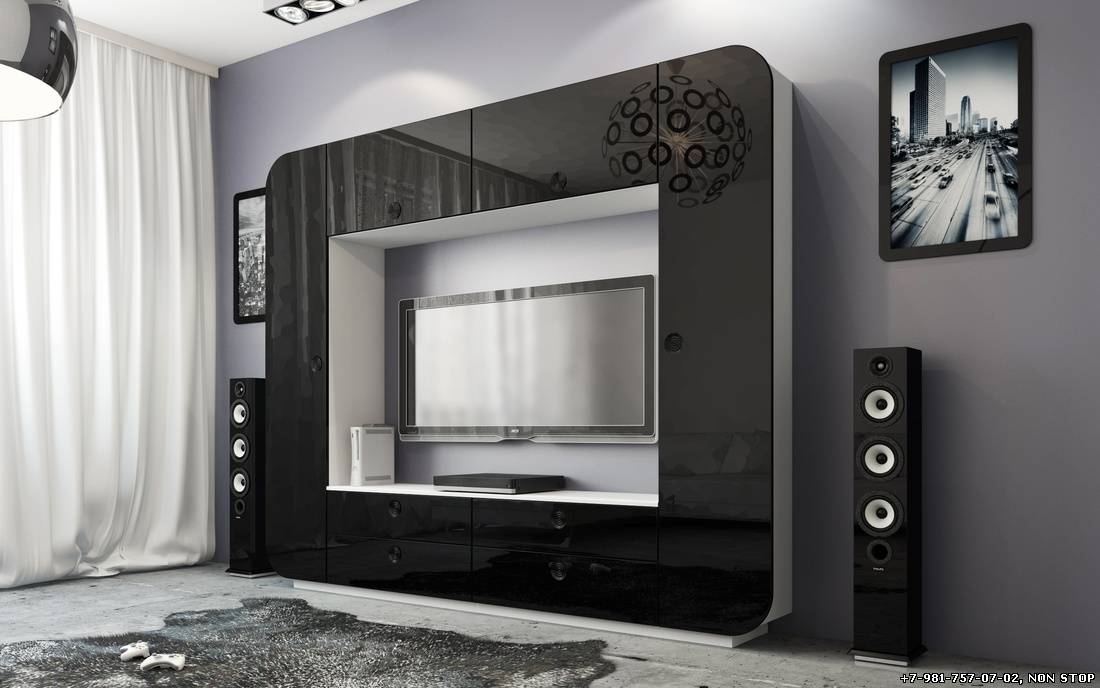 Гостиная iMeb Black (iPhone / iPad)Материал: глянцевый МДФЦвет: фасад глянец черный / корпус глянец белыйРазмер 1950*2400*h355 ммНиша под ТВ 1600х1000 ммГостиная (стенка) Для поклонников стиля iPhone / iPadБлагодаря