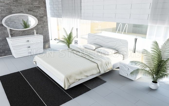 Необычные фасады, украшенные объемными 3D фрезеровками с изменяющейся геометрией, особые формы, сужающиеся книзу, и нетипично яркая лицевая фурнитура этой мебели для спальни смотрятся настолько красиво и гармонично, что сложно представить: такая продукция стоит недорого.